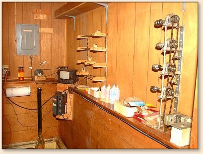 ![]() My varnish room is nine feet long by six and a half feet wide. It has it's own environment. It has it's own temperature, humidity controls and has an ionizer for dust control. The walls have number of chain driven turners for the drying of the varnish on winds. It also has a rather sophisticated dipping apparatus. This walk-in room is capable of hanging thirty joints at a time.