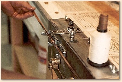 ![]() This machine has two purposes. After the strips have been milled and put in the proper order to make a joint they are wound dry with string before tempering. After the strips are tempered the string is pulled off. Then a razor blade is inserted between one of the six strips so it can be fanned open but remain in the proper sequence. Glue (Urac 185) is painted on the inside of the strips generously. The strip is then put back through the machine and now the machine will be used for gluing. The cane is put in the machine, string attached, and it is wound through. The tension on the string forces the excess glue out. A few half-hitches and then it is passed through the machine in the opposite direction, checked for straightness, excess glue wiped off with a damp sponge and hung in the drying room to dry. I generally glue enough joints at one time to make at least twelve rods. I use a different amount of weights between butts and tips as the tension on the string is not the same for both.