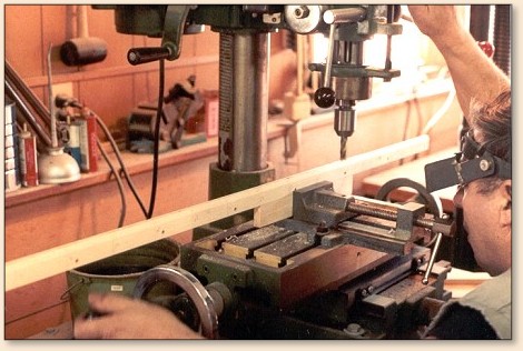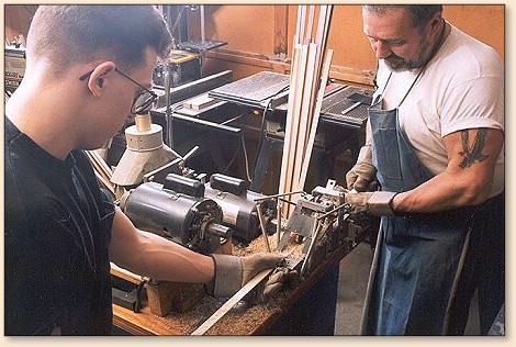 ![]() My son Eric and me running a strip through the thickness planner. This machine will hold tolerances of 1,000 of an inch. I generally plain them to 10,000 over so that when I run it through the 60 degree miller I don't have as much cane to mill so it makes a much more accurate cut. This is a push-pull machine and requires two people to operate.