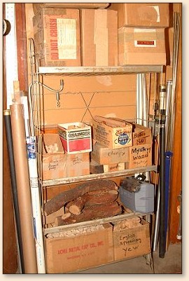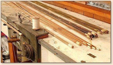 ![]() This rack has boxes of cork, maybe 4,000 - 6,000 corks. Some of this cork is older cork that I got from Jim Payne and from Leonard. This is plain, untreated cork from Portugal and is stamped on each and every cork. Also many kinds of wood are represented here for reel seats.