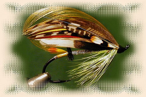 Tail: Golden pheasant crest and Indian crow sub. Butt: Black ostrich herl. Body: Rear 2/3, embossed silver tinsel; front 1/3 orange floss. Rib: Oval silver tinsel over all. Hackle: Golden Olive over the orange floss. Throat: Speckled Guinea fowl Wings: White-Tipped turkey underwing; married teal and barred wood duck; red and yellow goose; peacock; amherst pheasant tail; golden pheasant tail; bustard sub; mallard roof. Sides: Jungle Cock. Topping: Golden pheasant crest. Horns: Blue and yellow macaw. Head: Black.