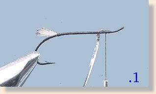 ![]() 4. Tie in two slender strips of golden pheasant center tail feather to lie low over hook shank, clip off feather ends, take a few extra turns of tying thread, whip-finish and varnish. ~ Art Lingren