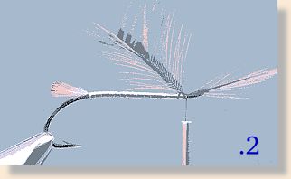 ![]() 2. After winding the Mylar tinsel in even turn down the hook shank to the tail and back to the eye, fix to the hook a folded natural red hackle with barbules a little longer than the hook gape.
