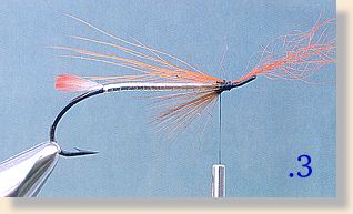 Tying Instructions:![]() 1. With a size 8 or 6 low-water salmon hook in the vise, tie in a small reddish orange feather for the tail, wind thread to hook eye and tie in about an 8-inch length of broad, flat silver Mylar tinsel.