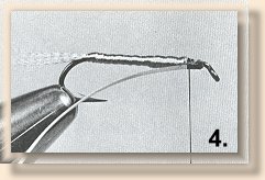 ![]() 5. Wrap tinsel backward completely covering floss body, then wrap forward again. Tie off behind hook eye and trim excess tinsel.