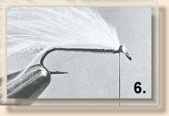 ![]() 6. Tie in a small bunch of white marabou feather fibers about 1/4 inch behind hook eye.