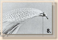 ![]() 8. Select a mallard flank or breast feather that is about half-again as long as the hook shank, and has a fairly straight stem. There should be an equal amount of feather fibers (barbules) on each side of the stem. Tie feather in along top of hook shank with concave side down along the shank, so the feather bends downward beyond the hook bend.