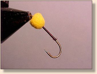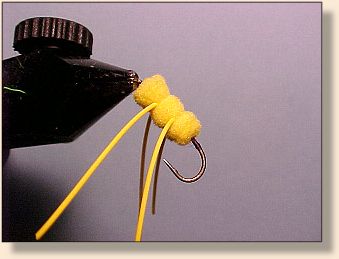 ![]() 5. Place another small drop of zap-a-gap behind the first pom pom. Push the second pom pom onto hook and snug up behind the first pom pom.