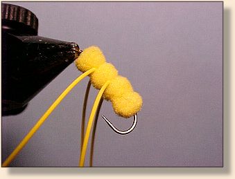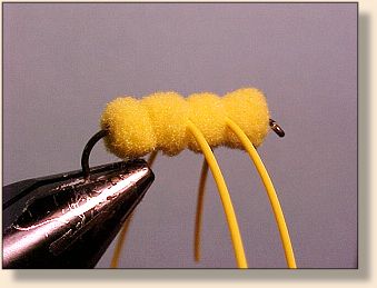 ![]() 6. Tie in the next set of legs, add a small drop of zap-a-gap just behind the legs and push up the third pom pom snugly in behind the legs.