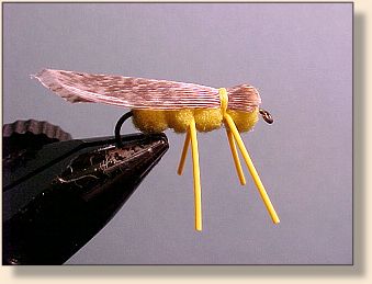 ![]() 9. Cut turkey feather to form wing for hopper. And use the yellow thread/flat floss to tie in wing. Ensure thread/floss is behind front legs and whip finish. Cut legs to desired length.