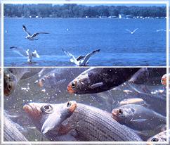 For fast action, nothing rivals jump-fishing for white bass. Huge schools of bass herd baitfish, especially shad to the surface. Attracted by the commotion, gulls swoop down to grab baitfish injured by the feeding bass.