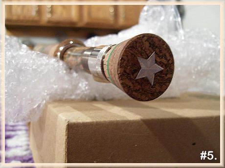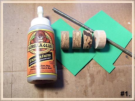 ![]() Making the handle and choosing the cork. The green craft foam is added for color trim. The cork rings and foam are glued individually together on a mandrel (shown in the next picture).