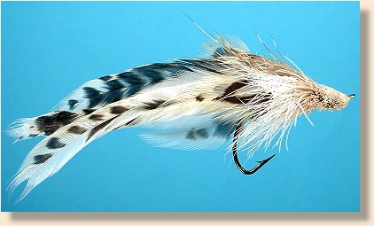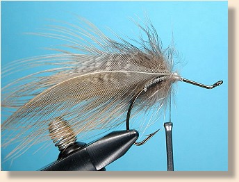 ![]() 3. Attach one set of feathers to the far side of the hook (curvature inward) as shown. Notice where the feathers are tied on the hook. This is important. You must leave enough room for a large head that follows some of the curvature of the hook if you want your fly to dive properly.