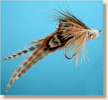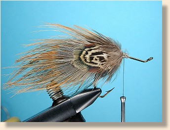 ![]() 2. Select and stack your tail/body feathers. Here I'm using four pheasant saddle feathers per side for bulk, color and markings. The longest and least marked feathers go to the middle with progressively shorter and better-marked feathers to the outside. It produces a colorful body with a certain sheen that fish like, and breathes well in the water.