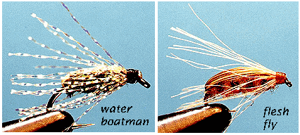 ![]() For instance, I tie a Shwapf with a pearl Krystal flash back and hackle, and a peacock body to imitate backswimmers (water boatman), those little aquatic bugs that look like they have oars on the sides of their bodies. I also use glass beads and dubbing to create flies that work as egg and flesh fly imitations.