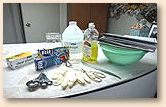 or glass or enamel pots and pans, tongs, measuring spoons, dyes,
