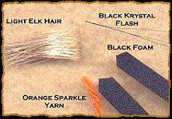 Tail: Tie in 5 or 6 strands of black Krystal Flash, slightly into the bend of the hook, extending 3/8" (9.5mm) beyond the end of the hook. |