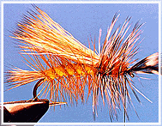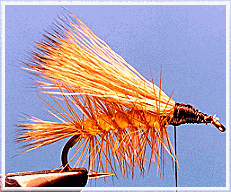 style" over the body and ribbed down with fine gold wire. Grizzly hackle