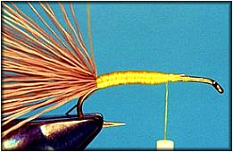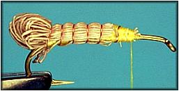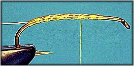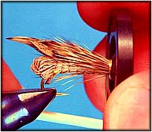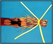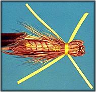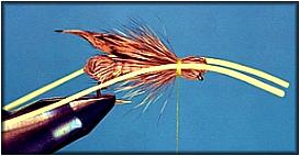 ![]() 6. Ate el ala inferior de pelo de alce usando la misma técnica que se uso para el saltamontes de Al. Corte el exceso de pelo y envuelva las puntas con hilo.