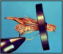 ![]() 11. Empuje la herramienta para cabezas de bala hacia atrás sobre el ojo del anzuelo hasta un punto justo encima del lugar donde aseguro el ala. Con la herramienta en su lugar puede emparejar el pelo alrededor del anzuelo.