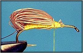 ![]() 15. Haga el whip finish y cemente. Después que se haya secado el cemento, levante las patas de caucho sobre el cuerpo, sosténgalas juntas como pares (adelante y atrás) y corte al largo adecuado. Las patas traseras deben extenderse hacia atrás del cuerpo, las delanteras deben extenderse justo delante de la cabeza.
