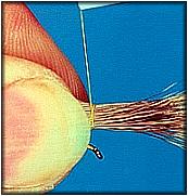 ![]() 10. Corte el exceso de pelo y cubra las puntas con hilo. Envuelva la porción de las puntas del pelo fuertemente con el hilo detrás del ojo. Envuelva el hilo hacia atrás hasta el punto donde el ala esta asegurada, cubriendo todo el pelo del área mientras lo hace.