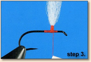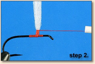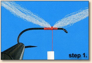 ![]() Step 1. With a twisted thread (p.42B), form a foundation that spans the mounting point. Position the thread at the wing at the mounting point. Cut a 2-3" length of poly yarn, half the thickness of the finished wing. Bind the center of the yarn tightly to the top of the shank.