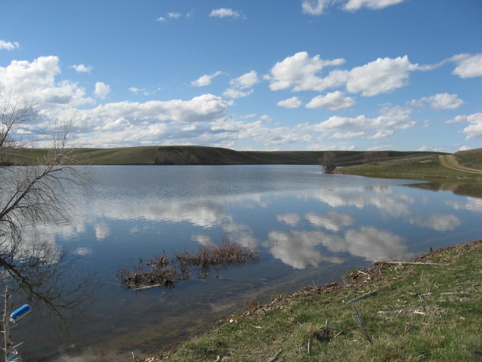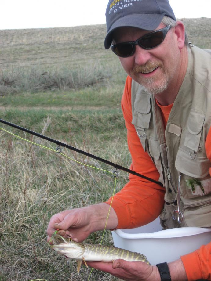 I went out yesterday (Saturday) after a full day of chores. Instead of heading into the mountains, I decided to try my hand at pike fishing in the shallow bays of Fresno Reservoir near Havre. It wasn’t until I started unpacking my gear that I realized I’d forgotten the fly box with my pike flies in it, so I tied on a clouser I’d tied up for trout. My friend, Tim called when I was on my way out there and said he’d join me. I had my pontoon all ready to go, and both rods strung up by the time he got there. Tim strapped on his stripping basket, and I floated out into the bay, excited to see what would transpire.