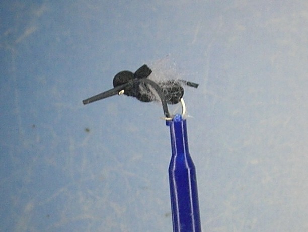 poke hole in foam strip, put on hook Tie two segments of foam on top and bottom hook, cut bottom foam, fold top foam bac over front thread wrap and tie down , add legs and wing