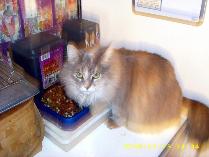 Here is my other cat, who also came to use by misadventure. This is Cali (short for calico). She was stuffed into a plastic bag and thrown out of a car window moving at 60+ miles per hour, in front of the house. Her nose was broken, and she had many internal injuries. I was up for 48 hours straight, trying to save her. Luckily, I was successful (nearest Vet was an hour away…she wouldn’t have made it).