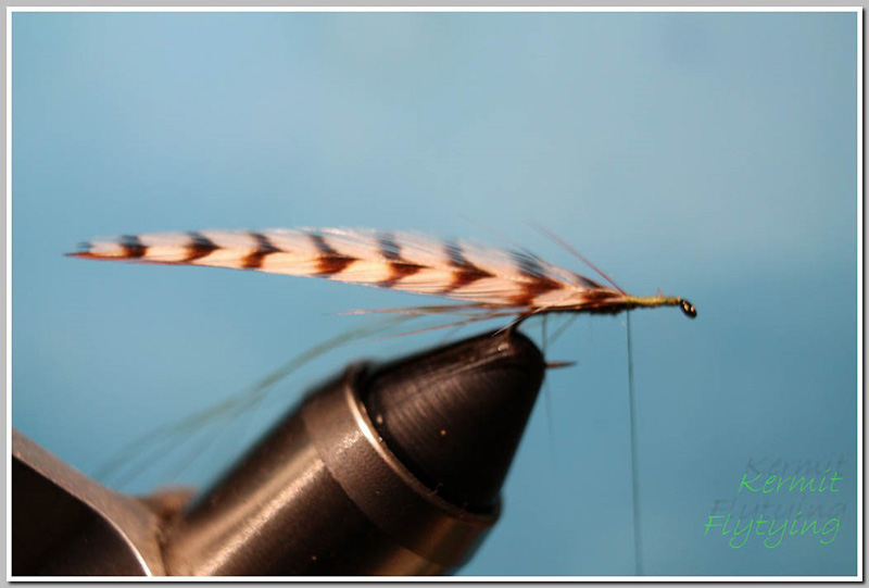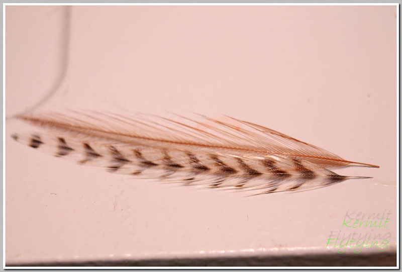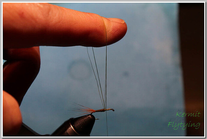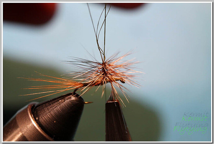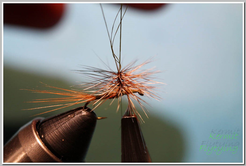 Pull the loops tight again, and hackle the hackles to above and down, take care that this will be become a fraction longer than the rest of the hook shank, and secure the hackles with a few windings at the underside, and cut the rest of the hackles off.