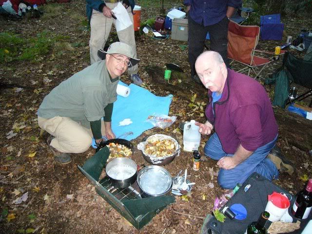 The second night’s camping spot was also overbooked, so we really had to rough it without table, benches or any other amenities. Here’s my twin brother Matt (aka: Methane Man) (left) and Crazy Tom making Boy Scout Beef Stew and dumplings in dutch ovens. I cannot describe just how delicious that stew was (especially after paddling 16.5 miles with loaded canoes). There was everything but the kitchen sink in it, and there was not one drop left in either pot. Appetizer was hot crab dip with crispy pita chips and cheese and cracker assortment. White & red wines were also offered. Dinner was followed up with cherry pie and chocolate pudding for dessert, along with Cowboy Coffee.