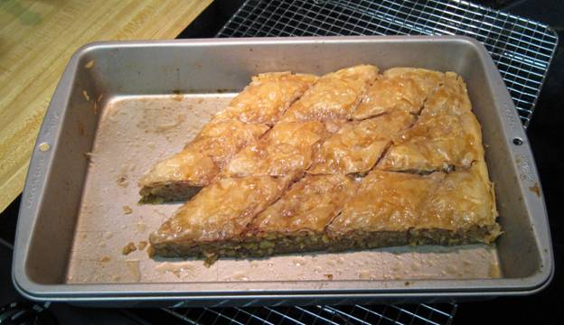 Using a sharp knife, cut into diamond shapes all the way to the bottom of the pan. You might make three cuts lengthwise and then cut diagonally to form the diamonds. Bake about 35 minutes until the baklava is golden and crisp.
