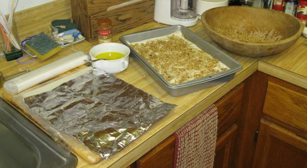 Phyllo dough (pronounced “feelo”) is available frozen at many grocery stores. It feels really odd and papery. The package will say cover with a damp towel; however, when I did, the dough stuck to the towel and made an enormous mess, so I use foil or plastic wrap between the dough and the damp towel.