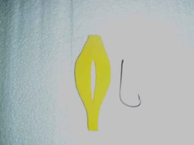 This is what it looks like before tying. The long narrow end is tied first at the tail, and the wider end is tied last at the head. The slit is closer to the tail than the head because any closer to the head will cause the loops to spread out too wide for good weed protection, at least that is what my gut feeling is when I cut it closer to the head end and tied some that way. I just didn’t like the way they looked. I think that Wayneb has a good idea to cut the tail end longer for more flotation. When I tie it to the hookshank I tie it on the hook side of the shank, I guess we call that the bottom side of the shank.