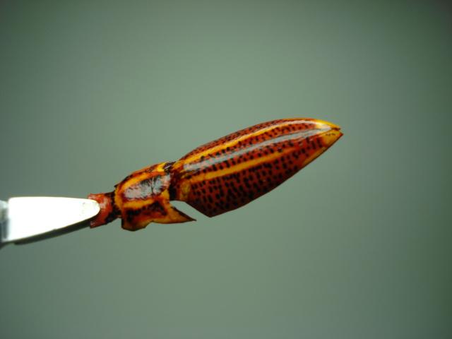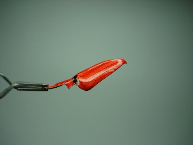 Ken I am going to introduce this material at Somerset and I hope tyers like it. To tye it is very simple; the tab I use to hold it is tyed behind the hook eye, forming the beetle?s head. Some thread turns, just between torax and abdomen, will fix the elitra to a foam body.