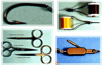 a few flies (vise, scissors, whip finisher, bobbins,
