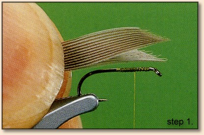 - Fix hook in vise and layer front half with thread. Select matching primary or secondary wing feathers from the right and left wings of a mallard or teal. Clip segments from each that is the width of the gap of the hook. Pair these together with their tips aligned and flared away from each other. If you’re using hen hackle tips, pair them back to back, and strip excess fuzzy fibers from the bases of the stems.