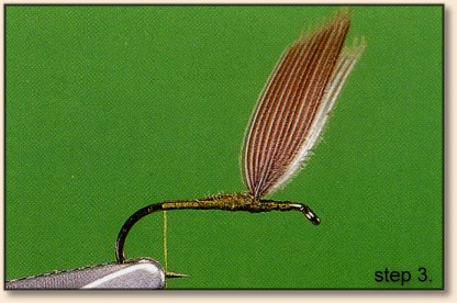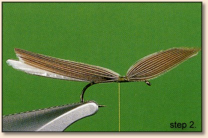 3. Take several turns of thread back over the butts to secure the wings, and clip the excess butts on a slant. Hold the wings upright and take several turns of thread in front of them to prop them in position. If necessary, take one or two figure eight turns between the wings to separate them. This will not usually be needed. Wrap thread over the wing butts and to the bend of the hook.