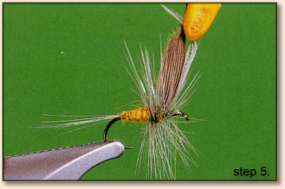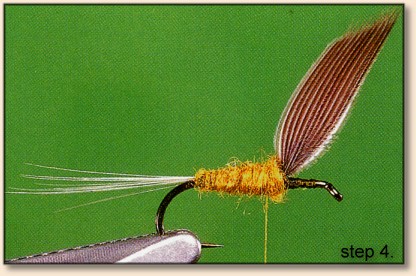 4. Measure eight to twelve stiff hackle fibers the length of the hook, and tie them in at the bend of the hook. They should be straight, and gathered, not splayed. Twist a fine skein of dubbing to the thread, and wind a neatly tapered body forward to the base of the wing.