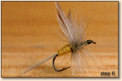 6. The traditional tie, when set on a tabletop, should perch on the tip of its tail and its hackle points, with the hook held just off the table. It will be quite an attractive apparatus to you, if properly tied, and will attract a surprising number of trout. Its shape captures perfectly that of the natural mayfly dun emerging and floating on slightly rough to very rough water.