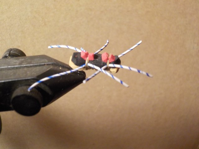 Posting the picture of a patriot dry fly got me thinking: Why not incorporate blue into other patterns? If blue is highly visible to fish it should work in other patterns. The result was this size 14 chernoble ant.