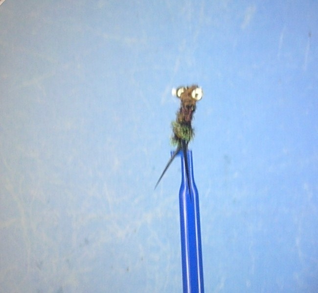 bead chain eyes, biot tail and mottled dubbing.