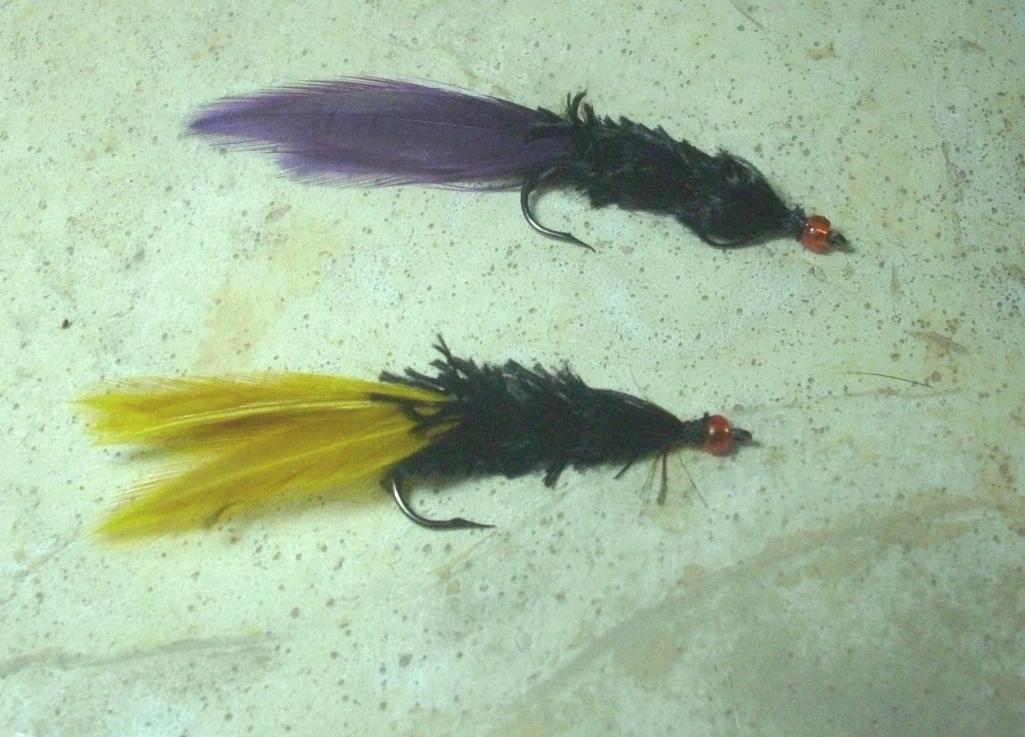 The post about yellow boa yarn got me thinking of tying some Boa for this summer. There is a couple of pot holes close by (thats 50 miles out here) that are over run with bass. Catches of 60 plus a day are common. Most of the fish are small but there is enough “keepers” to make the trip worth while. The picture shows a boa fly that really works on these fish. The hook is an Eagle Claw size one. The feathers are purple and gold, the boa yarn is black & the bead is orange glass. Sorry for the poor picture.