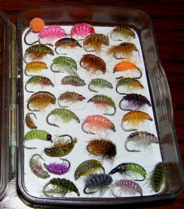 When I’ve examined the stomach contents of trout (ones I’ve eaten), I note that the scuds have turned white. The dead ones in the river are rusty, tan, or pale off-color turning white (netted). So I plan to so a series of white and off-white scuds. I also need to get a dead white scud to see if it has UV properites, then if they do, tie some with white UV materials.