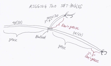 I rig up these soft-hackles as depicted below and fish in classic methods: cast down & cross, mend upstream to slow down, then let current take my line and flies. Trout can’t resist, follow soft-hackles, and set hooks automatically by themselves at typically corners of their mouths.