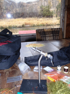 Tying at Eva’ Hut along DePuy’s Spring Creek…..