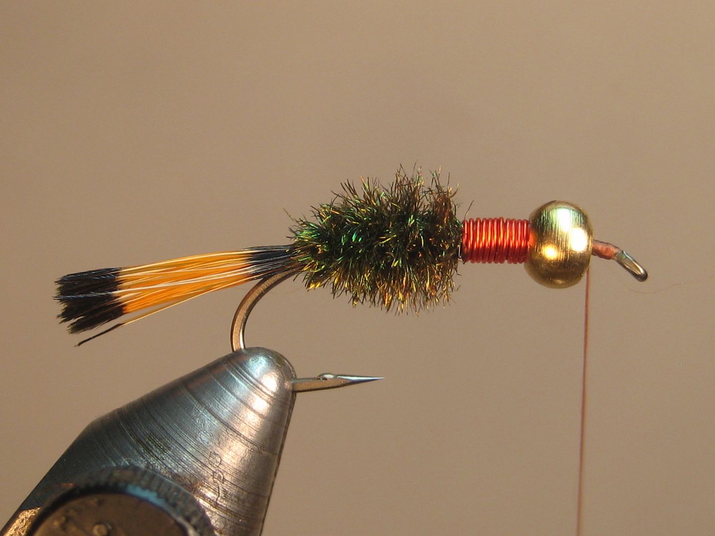 tie in wire; wrap to 3/4 mark, helicopter end, cover with thread, tie off