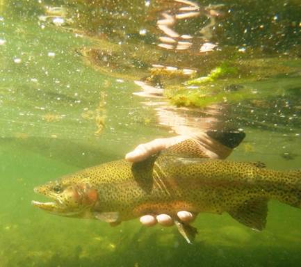 Sometimes a fish will put on a very determined struggle and once it is landed it is completely exhausted. This usually results from using a tippet that is too light, a rod that is too soft, or by an angler that is too inexperienced to land the fish quickly. Sometimes fish, especially cold water species, that are caught in water that is warmer than normal will come to the net completely exhausted. These fish need to be revived before they are released. It’s especially important to keep these fish in the water and once the hook is removed to hold the fish upright and gently move it back and forth in the water. This will allow water to flow over the gills. Hold the fish loosely and once it is sufficiently revived it will generally swim away.