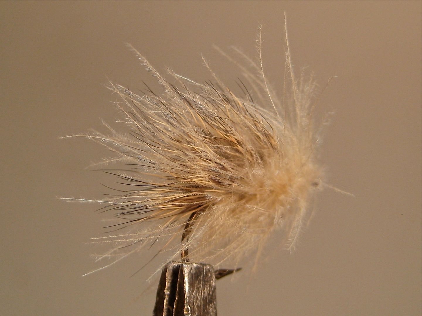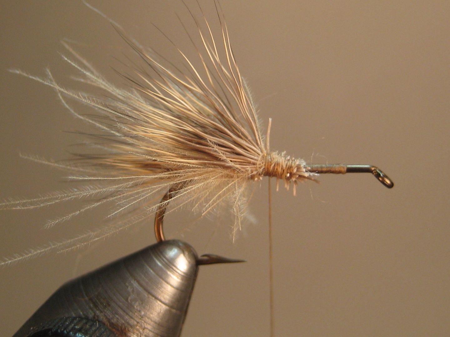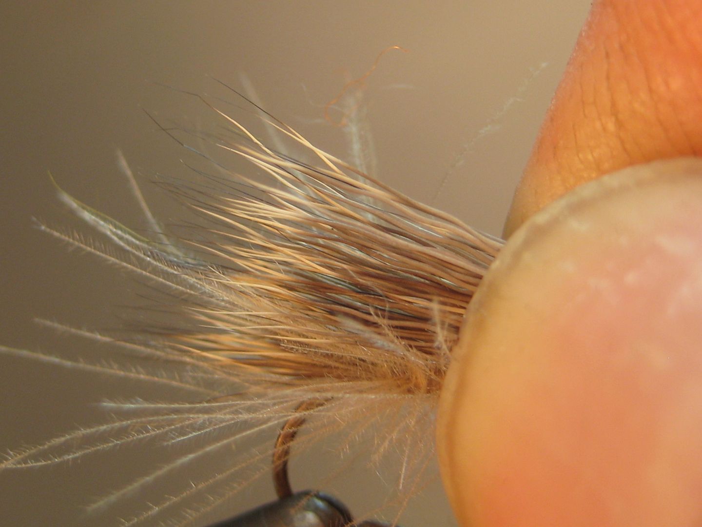 clean, measure (gap width past bend) a sparse clump of deer hair; tie in/trim